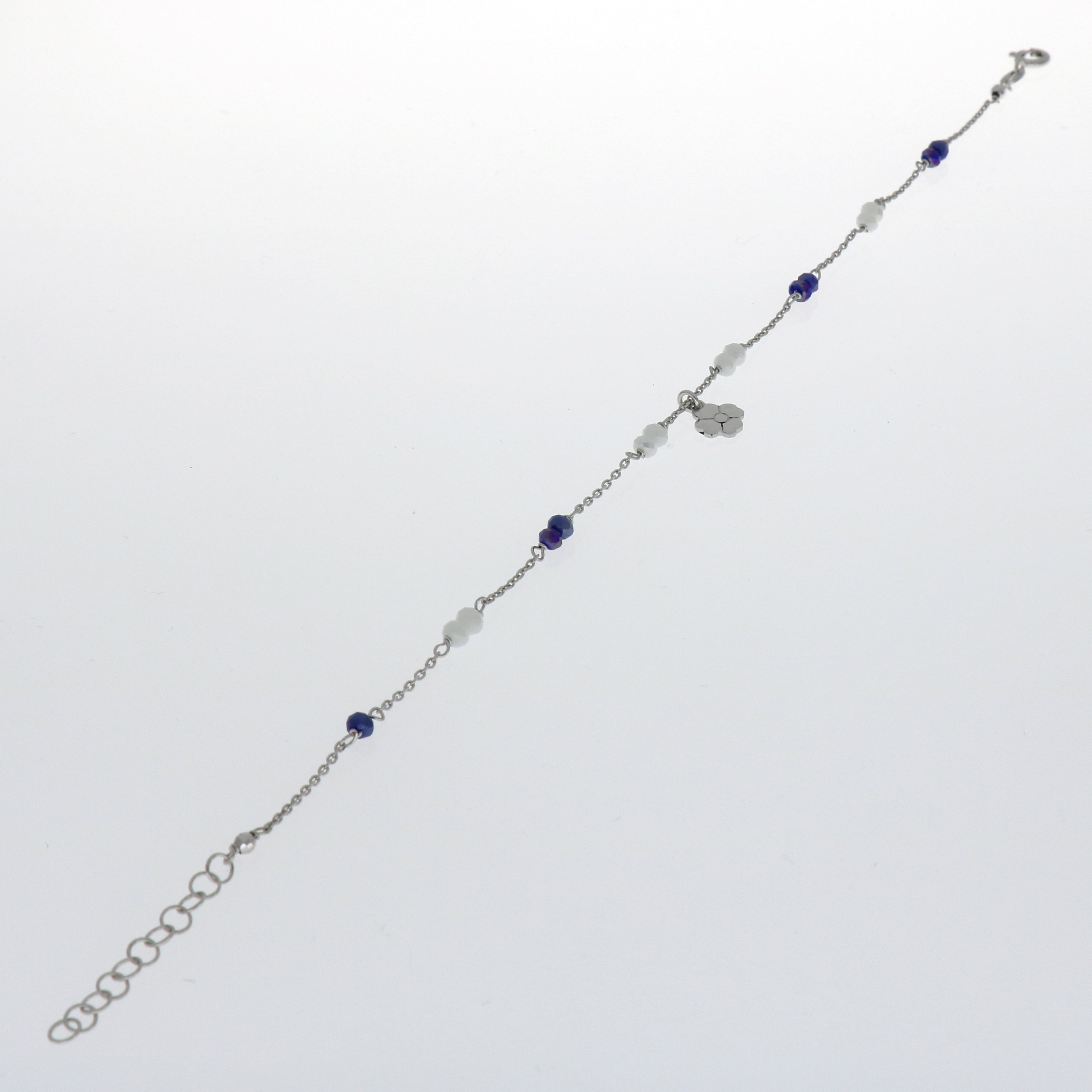 Tobillera de Plata rodiada con trebol y piedras blancas y azules